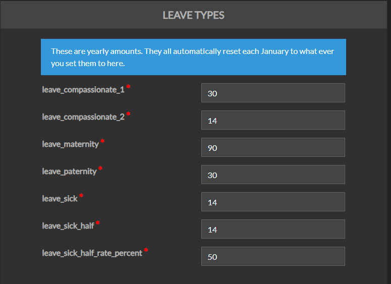 These fields appear when editing a company and each January, these values reset to the numbers specified here, ensuring that employees receive their allocated days for the new year. You can customize the values according to company policies: