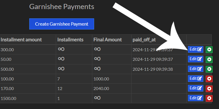 The Edit Garnishee feature enables payroll users to update the details of an existing garnishment. This includes modifying information such as the garnishment amount, installment period, or payment frequency. Editing a garnishee is useful when there are changes to the garnishment.