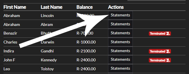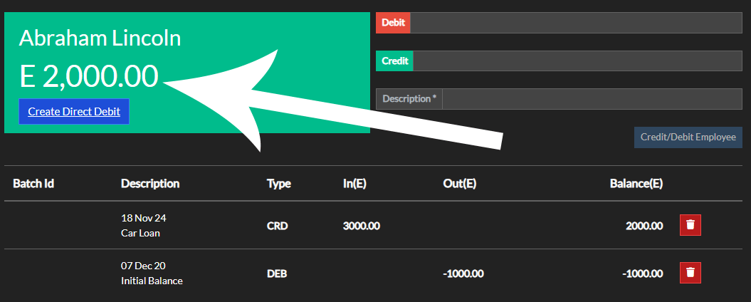 The payroll account works like a bank account. For example, if Abraham Lincoln is credited 3,000 for a car loan and debited 1,000 for repayment, his balance shows 2,000 (3,000 credit minus 1,000 debit).