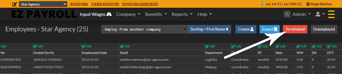 Click the green button next to the employee you want to re-employ